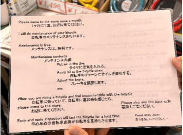 *修理の受付手順や代車の貸出規定、連絡先(メールアドレス)などをまとめた案内。聴覚障害のある方や、日本語に慣れていない外国人の方でも、お店の仕組みがひと目でわかるよう工夫されています。